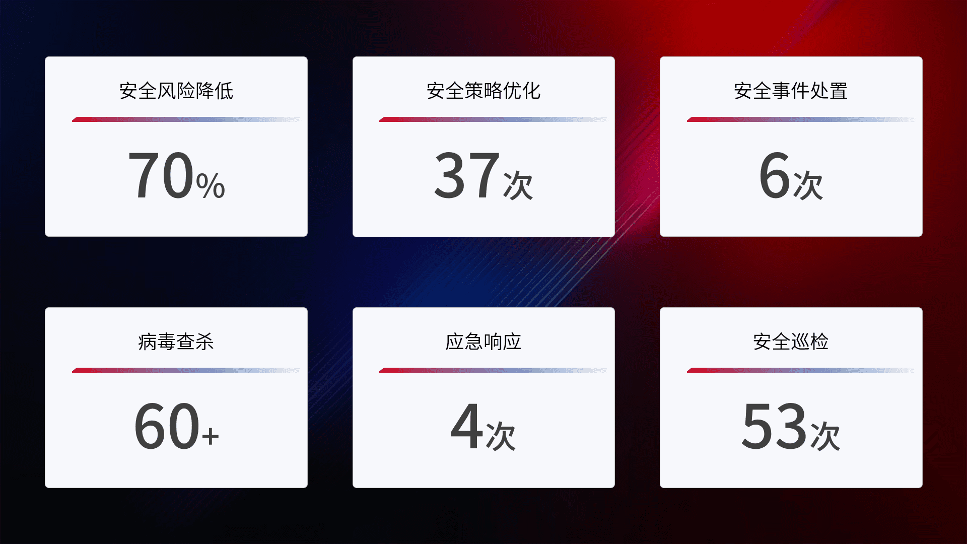 提供全面的安全事件报告体系,,包括处置报告、、周报、、季度和年度总结,,,,结合持续监控,,帮助客户深入了解网络安全状况。。